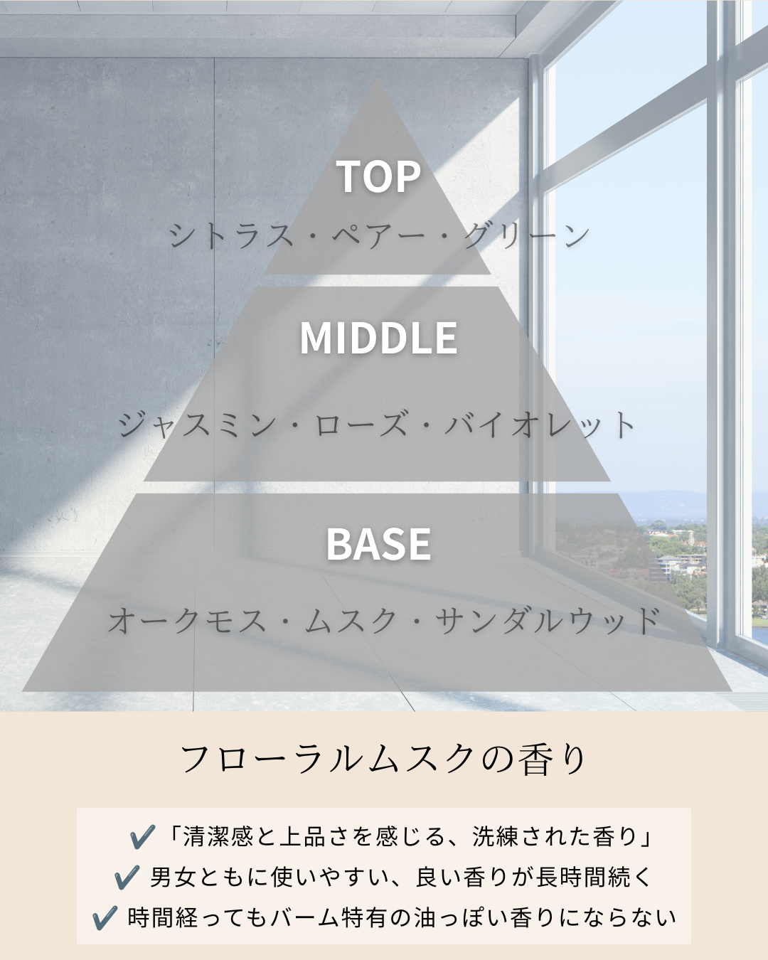 ローズ&ジャスミンの上品な甘さ、ムスクとサンダルウッドの温もり。